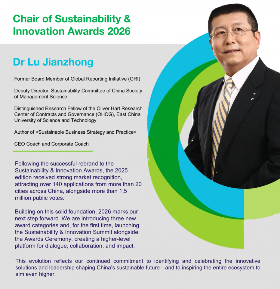 The Sustainability & Innovation Awards is a national awards programme that brings together a world-class panel of industry experts as part of a high-profile platform to recognise excellence in local and international organisations, NGOs, and individuals who are at the forefront of China-based sustainable practices.